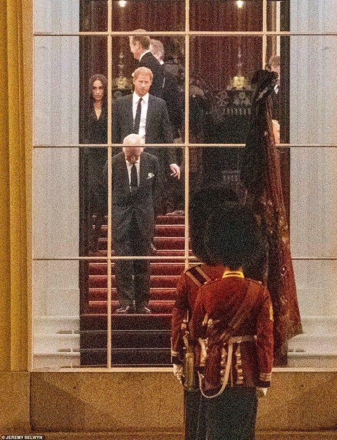 Cánh phóng viên đã chụp được hình ảnh Vua Charles III cúi đầu đứng trên bậc thang trong khi Harry và Meghan đứng ở sau lưng hỗ trợ nhà vua khi linh cữu Nữ hoàng được đưa vào bên trong điện Buckingham. Trước đó, chuyên cơ của Lực lượng Không quân Hoàng gia Anh đã chở linh cữu Nữ hoàng từ Edinburgh hạ cánh xuống RAF Northolt vào lúc 18h55 (giờ địa phương).