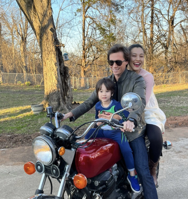 Cụ thể, trong bức ảnh vừa đăng tải, Hoàng Oanh cùng Jack Cole và con trai Max ngồi trên xe mô tô. Hoàng Oanh chủ động vòng tay qua eo chồng cũ, ôm chặt lấy con trai đang ngồi phía trước. Khung cảnh gia đình hạnh phúc cùng gương mặt rạng rỡ của nữ MC khiến người xem không thể tin là cặp đôi đã ly hôn.