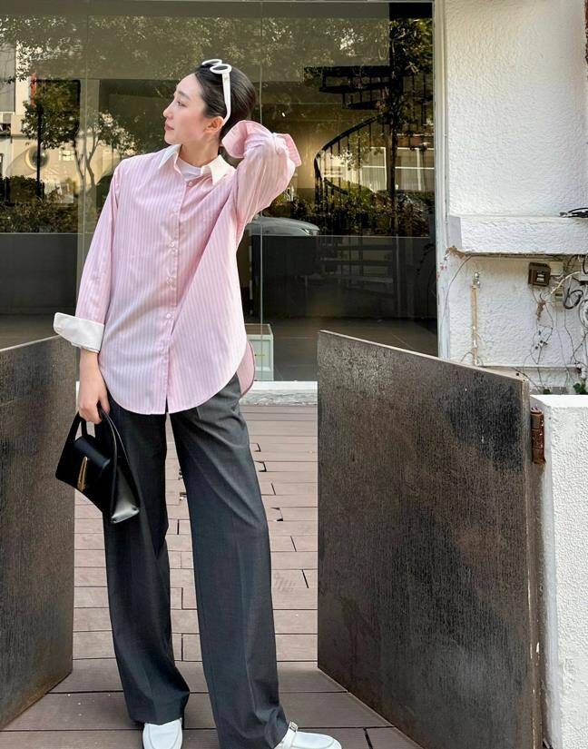 Bạn có thể bắt đầu với những lựa chọn đơn giản như áo sơ mi hồng nhạt kết hợp quần xám tạo nên set đồ công sở trẻ trung.