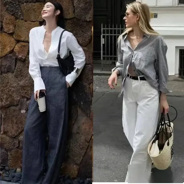 Trong môi trường công sở, áo sơ mi trắng hoặc xám kết hợp cùng quần âu sẽ giúp bạn xây dựng hình ảnh người phụ nữ trưởng thành, tự tin và đầy khí chất.