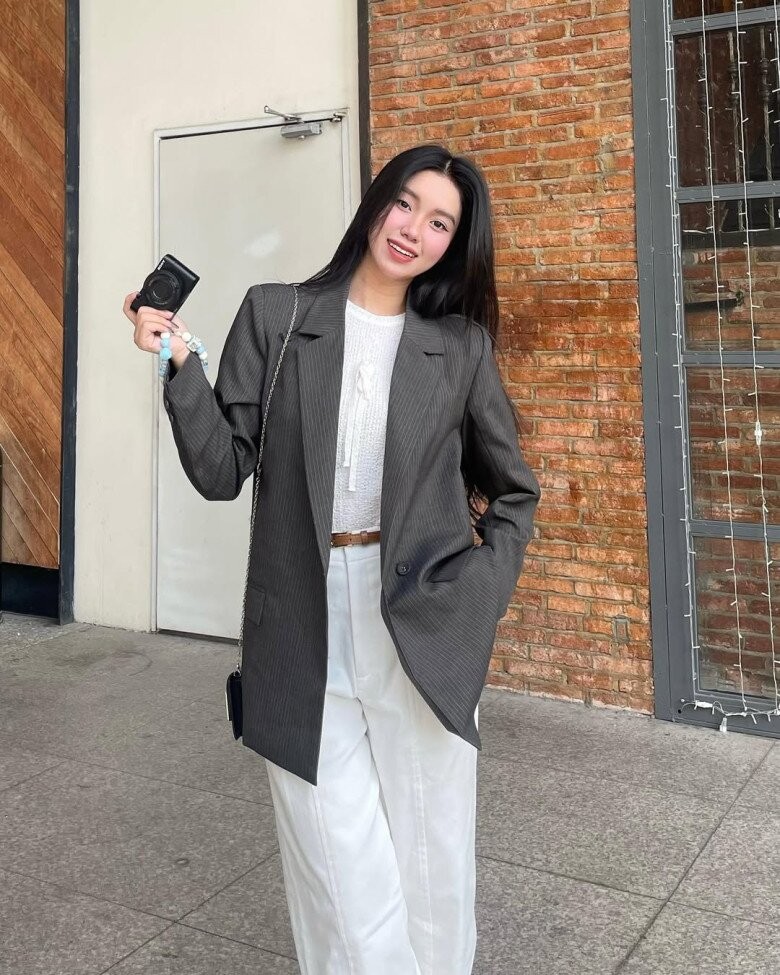 Màu xám vốn mang vẻ thanh lịch và trí tuệ, rất phù hợp với phụ nữ trưởng thành. Khi kết hợp cùng màu trắng tinh khôi và nhẹ nhàng, tổng thể trang phục càng trở nên tươi mới, tinh tế mà vẫn giữ được nét trang nhã cần có.