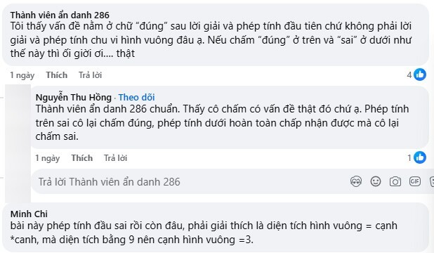 - Điều em quan tâm lại không phải cô giáo chấm phép tính sai, mà là phép tính ngay từ đầu đã sai bản chất hoàn toàn thì cô giáo lại chấm đúng. Phép tính dưới tính chu vi thì thật ra con không sai, phép tính đó hoàn toàn có thể chấp nhận được. Nếu có trừ thì chỉ nên trừ một chút điểm để nhắc con làm đúng công thức, để sau này tính ngược lại con dễ tính toán hơn.