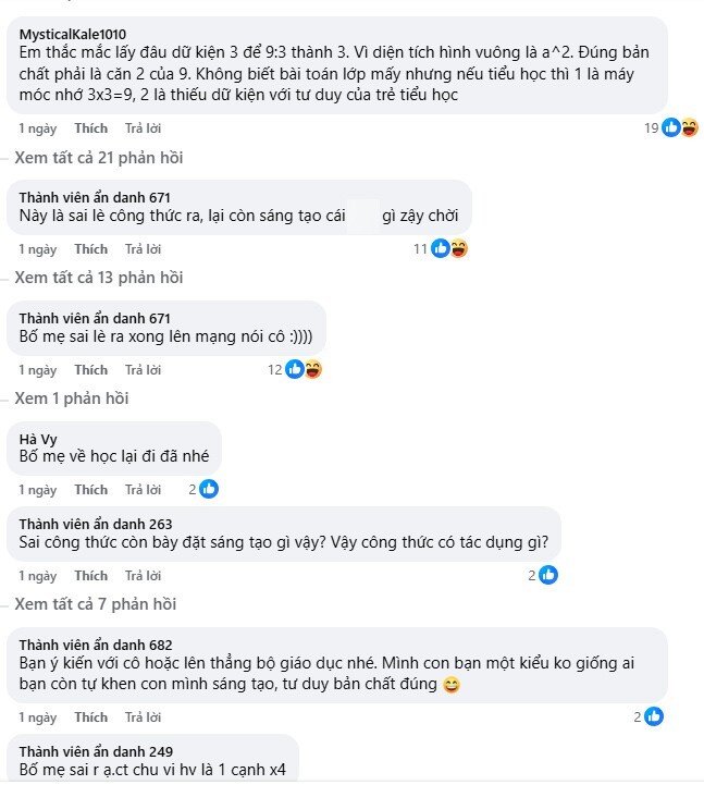 Nhiều bậc phụ huynh có mặt trên diễn đàn để lại bình luận đứng về phía cô giáo, cho rằng em học sinh đã hiểu sai, làm sai bài toán. Thậm chí còn thẳng thắn cho rằng cách người mẹ bảo vệ con mình cũng hoàn toàn sai vì toán học có công thức rõ ràng và không thể sáng tạo như thế được.