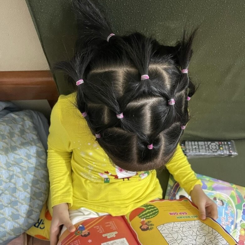 - Bảo sao ngày nào cũng thích đi học, chiều về là một kiểu tóc khác nhau mỗi ngày. Thậm chí có những hôm không cho mẹ buộc tóc còn để đến lớp cô tết đẹp hơn.