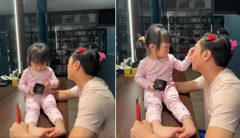 Cường Đô La làm mẫu để cho con gái trang điểm. Suchin đã biết đánh mắt, má hồng, tô son cho bố nhưng ấn tượng nhất có lẽ phải kể đến hàng ria mép đầy ấn tượng.