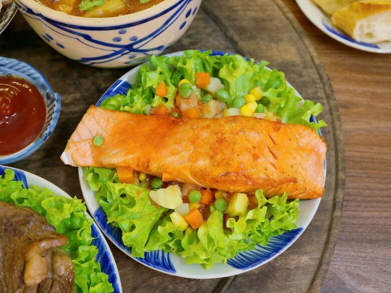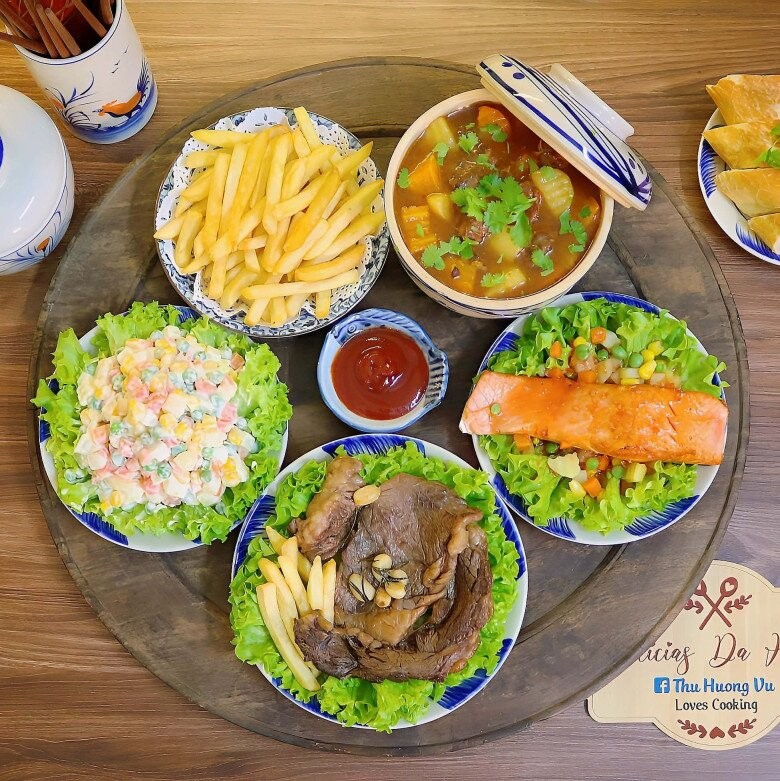 Mâm cơm này là sự kết hợp hài hòa giữa món Âu quen thuộc và hương vị dễ ăn, phù hợp cho những bữa ăn gia đình hoặc dịp tụ họp cuối tuần. Cá hồi áp chảo béo mềm, thơm nhẹ, ăn kèm salad rau củ tươi mát giúp cân bằng vị giác. Bò sốt vang đậm đà, mềm ngọt kết hợp cùng bò bít tết áp chảo vừa đủ độ tạo điểm nhấn hấp dẫn cho bữa ăn. Khoai tây chiên giòn rụm là món ăn kèm đơn giản nhưng dễ “ghi điểm”, khiến mâm cơm thêm trọn vị.