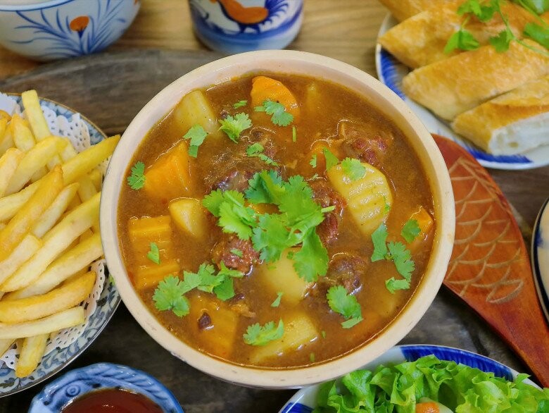 Chuẩn bị: - 400 thịt dẻ sườn bò hoặc phần thịt bò có nhiều gân - 2 quả cà chua; 1 củ cà rốt cỡ vừa, 2 củ khoai tây, nửa chén rượu vang; 2 thìa nhỏ thịt quả gấc; 1/2 gói ngũ vị hương; 1 miếng quế; 2 bông hoa hồi; 2 thìa nhỏ đường; gia vị nước mắm bột nêm vừa miệng.