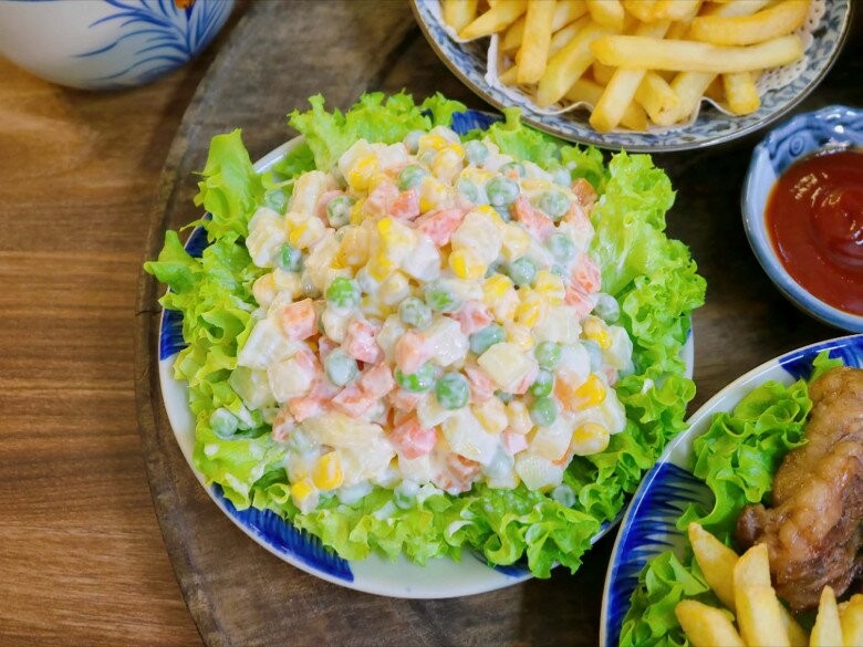Cho ngô ngọt, đậu Hà Lan, cà rốt, khoai tây vào nồi nước sôi luộc chín tới rồi vớt ra. Cho mayonnaise vào trộn đều là xong.