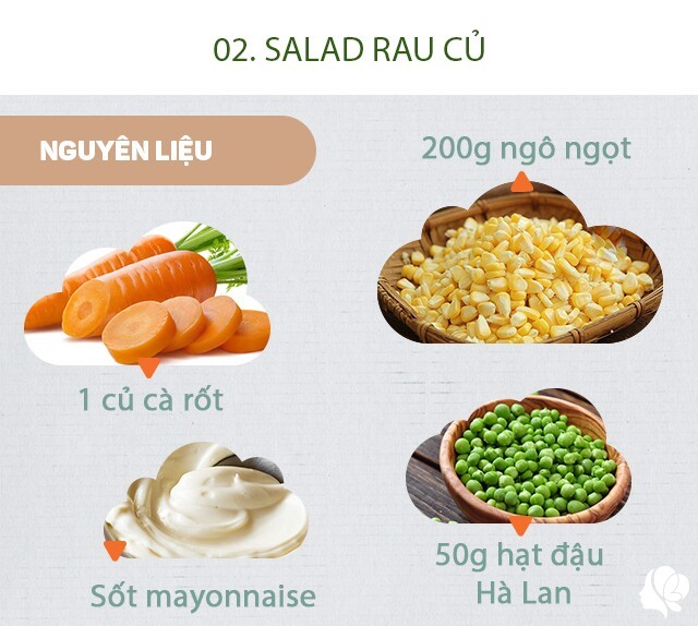 Chuẩn bị: 200g ngô ngọt, 50g hạt đậu Hà Lan, 1 củ cà rốt gọt vỏ thái hạt lựu, sốt mayonnaise, 1 củ khoai tây gọt vỏ rửa sạch thái hạt lựu.