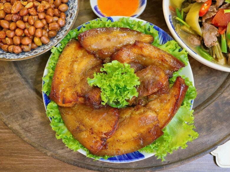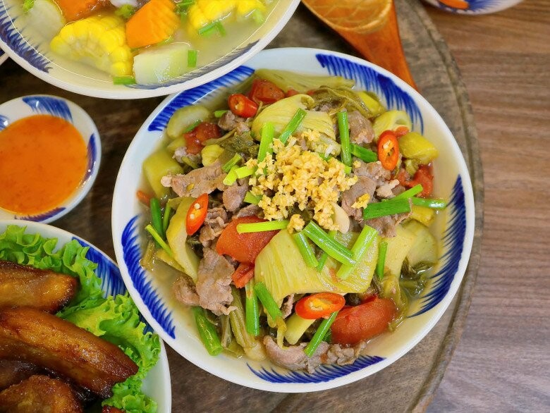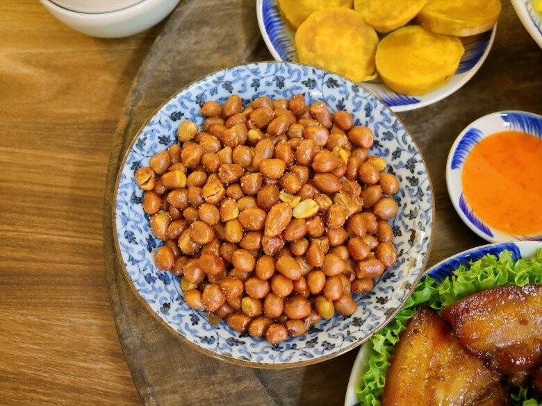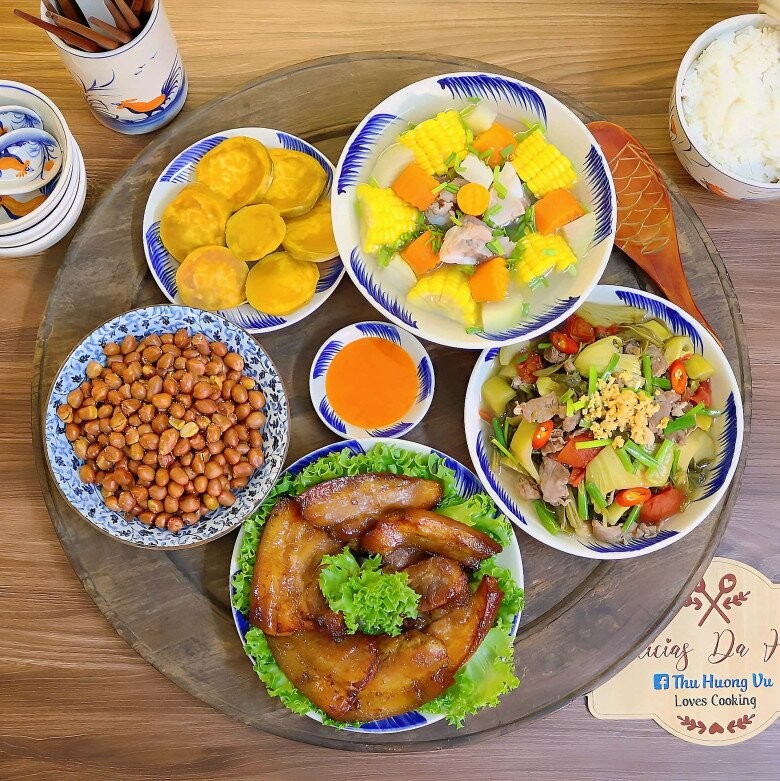 Mâm cơm hôm nay gợi cảm giác thân quen của bữa ăn gia đình với những món dễ nấu, dễ ăn mà vẫn đủ đầy dinh dưỡng. Thịt ba nướng vàng thơm đậm đà, thịt bò xào dưa chua chua dịu chống ngán, bát canh sườn nấu ngô ngọt, su hào, cà rốt thanh mát cân vị cho cả mâm. Thêm đĩa lạc rang mặn bùi bùi và khoai lang luộc ngọt tự nhiên, bữa cơm tuy giản dị nhưng tròn vị, phù hợp cho những ngày muốn ăn ngon mà không quá cầu kỳ.