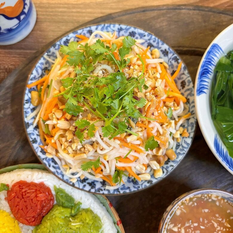 Su hào, cà rốt gọt vỏ rửa sạch rồi nạo sợi. Hành tây bóc vỏ, rửa sạch rồi thái mỏng. Hòa 2 thìa nước mắm, 2 thìa đường, 2 thìa giấm, 1/2 thìa nước cốt chanh thêm tỏi và ớt băm vào. (Tùy theo độ mặn của nước mắm mà nêm nếm cho hợp lý). Đổ nước trộn vào bát hỗn hợp su hào, cà rốt, hành tây. Đảo đều. Sau đó cho kinh giới cắt nhỏ vào. Trộn đều. Khi ăn rắc lạc rang lên.