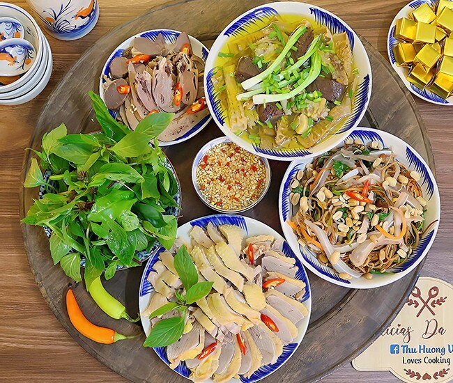 Mâm cơm “chân ái” dành cho hội mê đồ quê đây rồi! Từ thịt ngan luộc mềm thơm, chấm mắm gừng là “cuốn” ngay từ miếng đầu tiên, đến canh măng khô nấu xương ngan, tiết ngan ngọt thanh, nóng hổi, húp một thìa là thấy ấm bụng liền. Điểm nhấn là nộm tai heo hoa chuối giòn sật, chua cay mặn ngọt cực bắt miệng, ăn hoài không ngán. "Chốt hạ" thêm đĩa rau thơm tươi xanh, thơm nức mũi - nhìn thôi là đã thấy đói rồi! Một mâm cơm tuy giản dị mà chất lượng khỏi bàn, ăn là mê, nghiện là cái chắc.