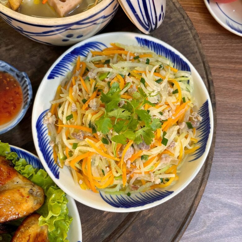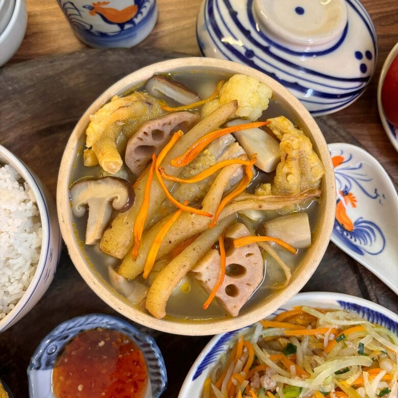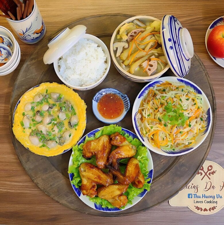 Một mâm cơm đúng nghĩa không chỉ để lấp đầy chiếc bụng đói, mà còn là sự cân bằng tinh tế giữa sắc, hương và vị. Tại đây, bạn sẽ tìm thấy chút ngọt ngào, óng ả từ cánh gà nướng mật ong hòa quyện cùng vị béo ngậy đặc trưng của trứng tráng hàu. Để vị giác thêm phần nhẹ lòng, bát canh gà hầm nấm củ sen thanh khiết là lựa chọn vỗ về tuyệt vời, kết hợp cùng đĩa su hào, cà rốt xào giòn ngọt, giữ trọn màu sắc tự nhiên của rau củ. Mỗi món ăn là một mảnh ghép nhỏ, tạo nên một bữa cơm đủ đầy, mang theo hơi ấm gia đình.