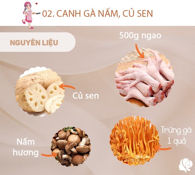 Chuẩn bị: 2 cái chân gà + cổ gà chặt miếng, vài cái nấm hương tươi, một ít rễ sâm, 1 khúc củ sen, vài miếng súp lơ, một ít nấm đông trùng, hành khô, muối.