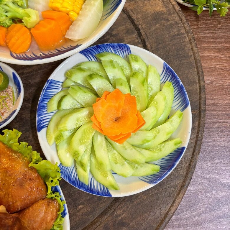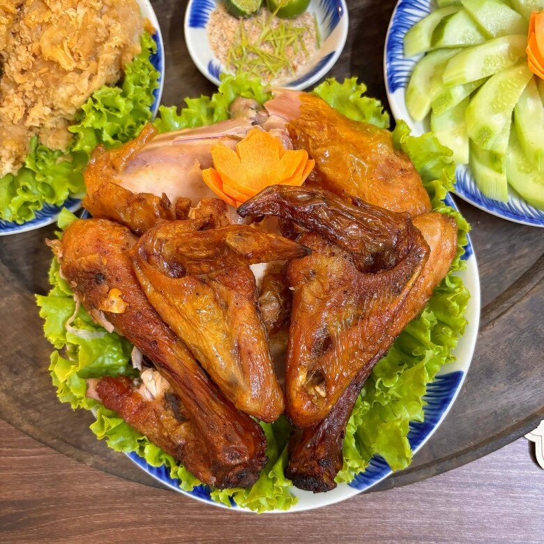 Mâm cơm giản dị nhưng đầy đặn với những món gà được chế biến theo nhiều cách khác nhau, mang đến hương vị phong phú và hấp dẫn. Từ gà nướng mật ong đậm đà, thơm lừng, đùi gà chiên giòn vàng ruộm cho đến nui xoắn sắc màu xào lườn gà vừa bắt mắt vừa giàu dinh dưỡng. Đi kèm là dưa chuột nếp thanh mát giúp cân bằng vị giác và canh chân gà hầm rau củ ngọt dịu, ấm lòng. Tất cả hòa cùng bát cơm trắng gạo quê dẻo thơm, tạo nên một bữa cơm gia đình gần gũi, đủ đầy và tròn vị.