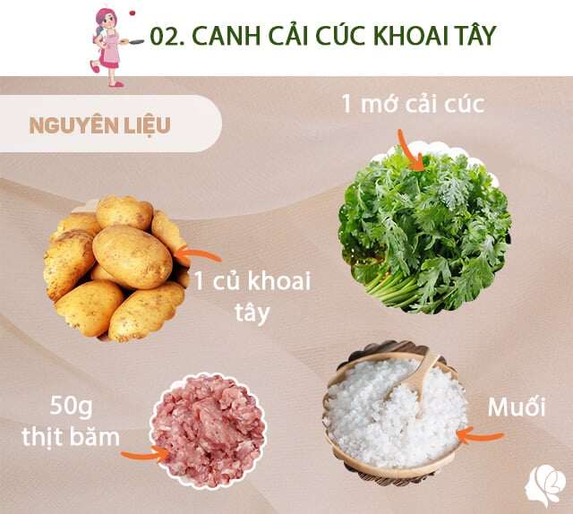 Chuẩn bị: 1 mớ cải cúc, 1 củ khoai tây, muối, 50g thịt băm, hành khô, hạt tiêu, dầu ăn.