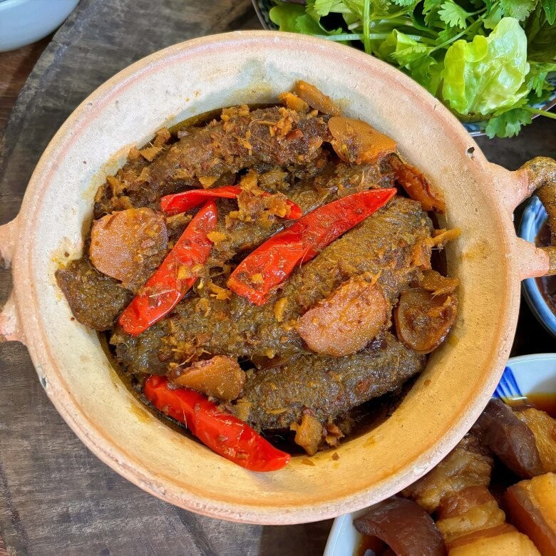 Mâm cơm mang đậm hương vị bữa cơm gia đình miền Bắc, mộc mạc mà ấm áp. thịt ba chỉ kho trứng cút đậm đà, béo mềm ăn cùng cá chạch kho tương thơm nồng, dậy mùi tương bần. Bát canh sườn nấu dưa cải chua giúp cân vị, thanh nhẹ và dễ ăn. Ăn kèm là đĩa rau sống rau thơm tươi mát và bánh chưng rán vàng ruộm, tạo nên bữa cơm giản dị nhưng rất tròn vị, đúng chất cơm nhà.