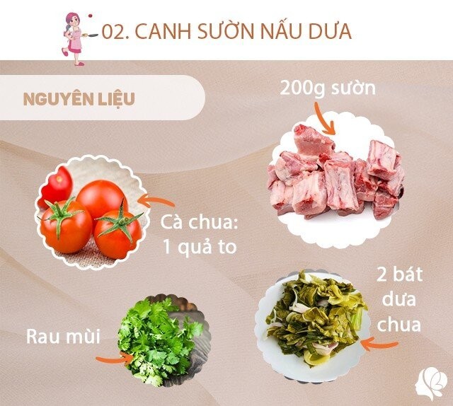 Chuẩn bị: 200g sườn, 1 quả cà chua, 2 bát dưa chua, rau mùi, hành lá, muối.