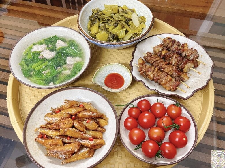 Mâm cơm hôm nay đơn giản mà đủ đầy, hài hòa giữa các món. Cá đùi gà rán vàng giòn, bên trong mềm ngọt, ăn cùng cơm nóng rất ngon miệng. Thịt nướng xiên thơm lừng, đậm đà, tạo điểm nhấn cho bữa ăn. Bát canh cải nấu mọc thanh mát giúp cân bằng vị giác, ăn vào nhẹ nhàng, dễ chịu. Đi kèm là dưa cải chua xào giòn giòn, ăn cực trôi cơm.