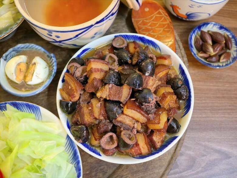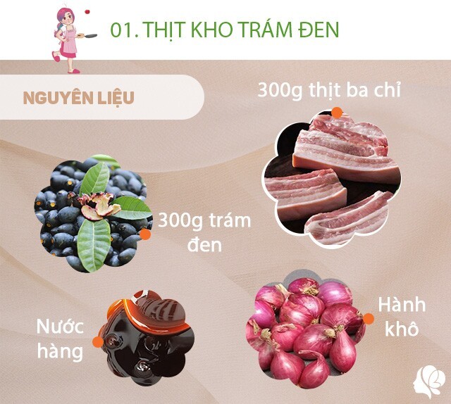 Chuẩn bị: 300g thịt ba chỉ, 300g trám đen, hành khô, nước hàng, nước mắm, muối.
