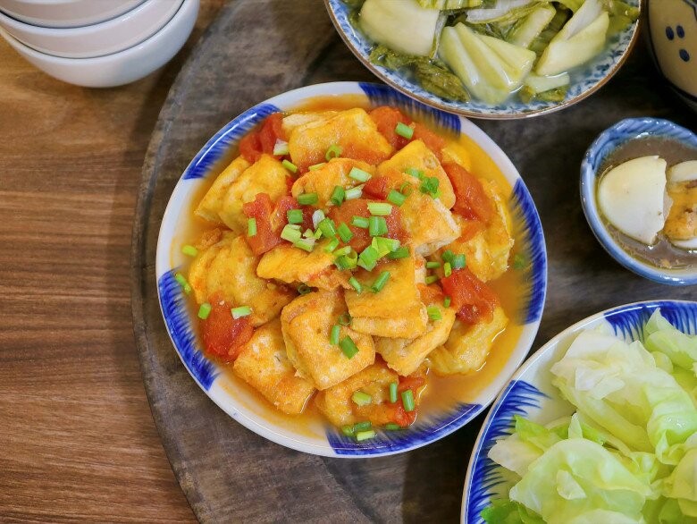 Chuẩn bị: 3 thanh đậu phụ, 400g cà chua, dầu ăn, hành lá, 1 củ hành khô.