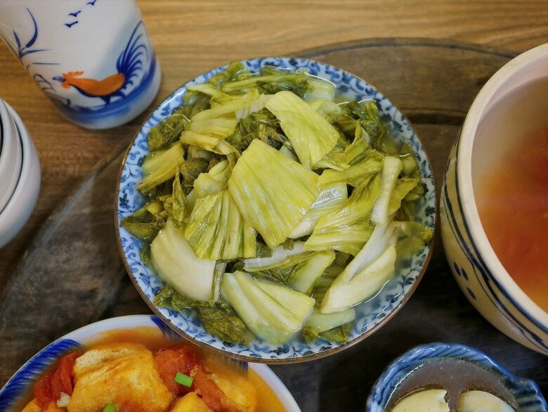 - Phơi cải, hành tím và hành lá ngoài trời nắng 1 ngày để rau hơi héo lại. Cho 20g muối, 60g đường, 30ml giấm vào một lọ thủy tinh/nhựa sạch, đổ nước ấm (40 - 50 độ C) vào khoảng 1/2 chiều cao lọ, khuấy đều cho tan muối và đường. Cho cải, hành tím và hành lá vào lọ, ngập hoàn toàn dưới nước. Đậy kín, bảo quản nơi khô mát khoảng 2 ngày, trước khi dùng. Dọn dưa cải muối chua ra dùng chung với cơm.