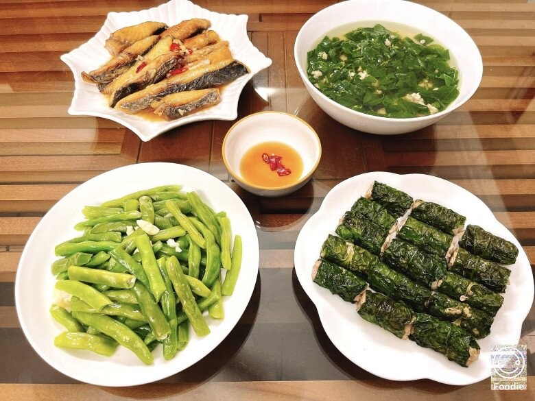 Mâm cơm hôm nay mang đến cảm giác quen thuộc, đậm đà hương vị gia đình với sự kết hợp hài hòa giữa các món mặn - canh - xào. Chả lá lốt thơm lừng, cá thu rim mắm tỏi đậm vị đưa cơm, ăn kèm canh rau ngót thịt băm thanh mát giúp cân bằng vị giác. Bên cạnh đó, đậu cô ve xào tỏi giòn xanh, đơn giản nhưng đủ để làm tròn vị cho bữa ăn. Tất cả tạo nên một mâm cơm không cầu kỳ nhưng ấm cúng, dễ ăn và phù hợp cho những ngày bận rộn.