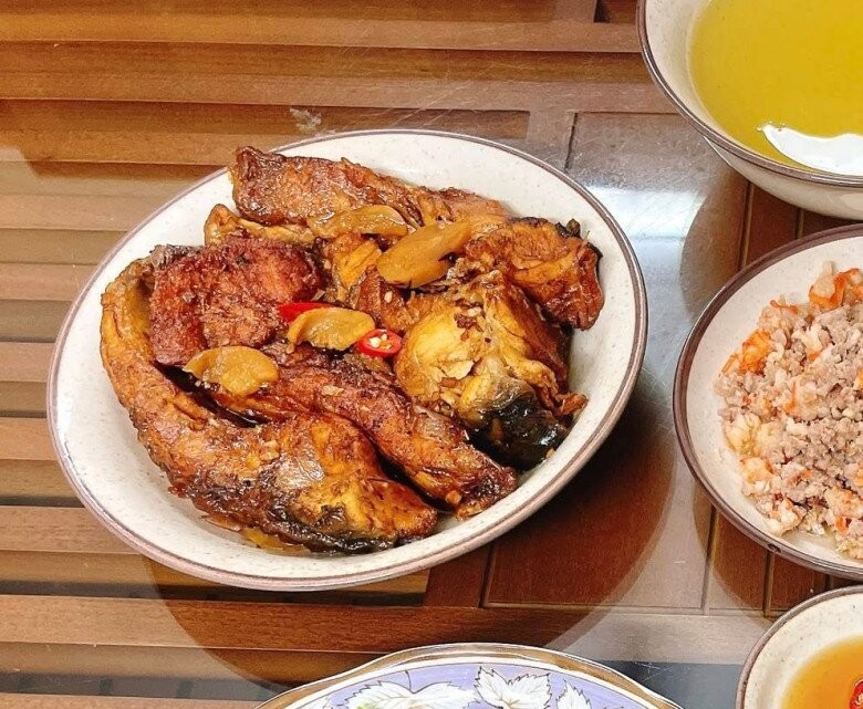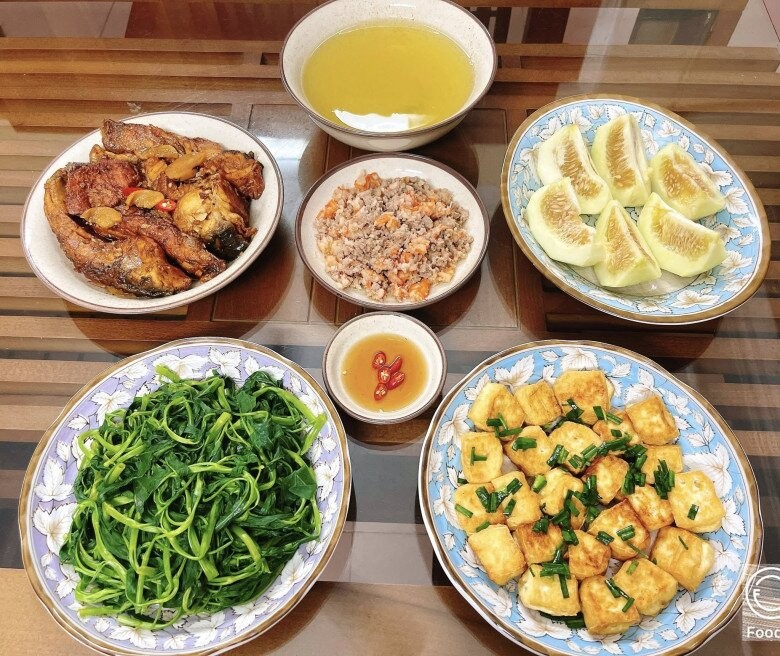 Mâm cơm hôm nay là sự kết hợp quen thuộc nhưng rất đưa cơm, phù hợp cho bữa ăn gia đình hằng ngày. Cá trắm kho riềng đậm đà, thơm nức mùi riềng, ăn cùng rau muống luộc xanh mướt, chấm chút nước mắm là đủ ngon. Đậu phụ tẩm hành béo mềm, giản dị mà hấp dẫn, đi kèm thịt băm rang tôm mặn mà, dậy vị. Tráng miệng thêm dưa lê ngọt mát, giúp bữa ăn trở nên nhẹ nhàng và dễ chịu hơn.