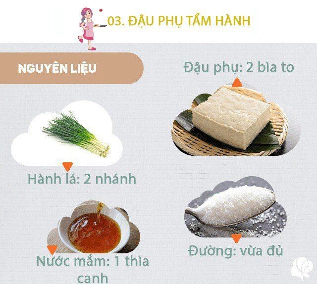 Chuẩn bị: 2 bìa đậu phụ to hoặc 3 bìa nhỏ, 1 thìa canh nước mắm, xíu đường, 2 nhánh hành lá.