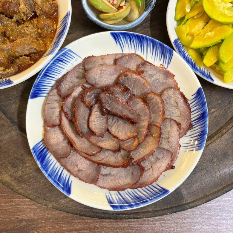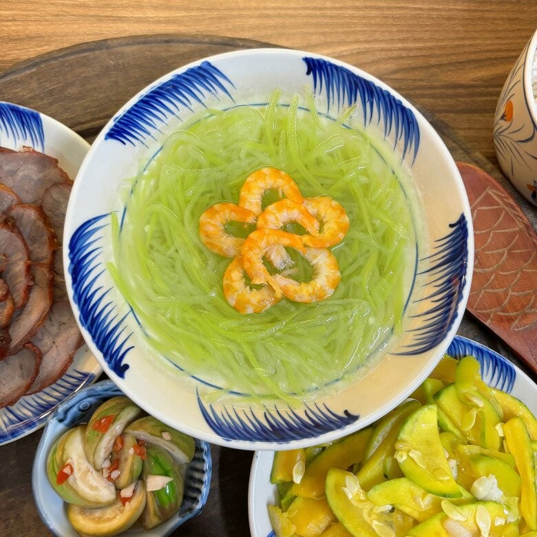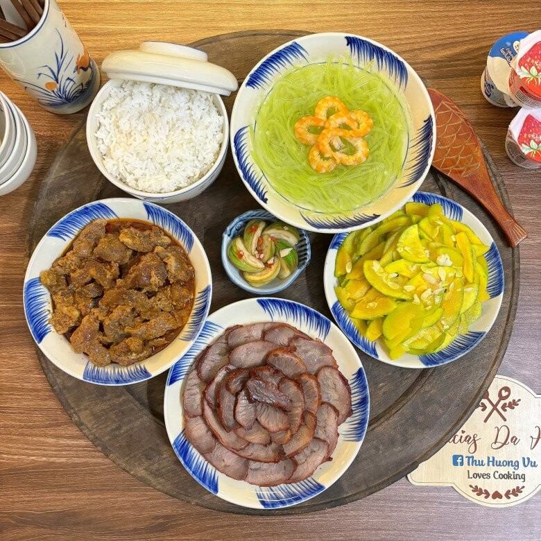 Mâm cơm hôm nay là sự kết hợp hài hòa giữa món mặn đậm đà và món thanh nhẹ, mang lại cảm giác tròn vị, dễ ăn. Xá xíu má đào mềm thơm, đậm vị làm điểm nhấn chính, ăn kèm với gân thăn bò kho đậm đà, dậy mùi hấp dẫn. Bên cạnh đó, bí non xào tỏi giòn ngọt giúp cân bằng vị giác, còn canh bầu nấu tôm thanh mát lại rất hợp cho những ngày oi nóng. Kết thúc bằng cà bát dầm chua nhẹ, giòn giòn, cả mâm cơm trở nên hài hòa, đưa cơm và không hề ngấy.