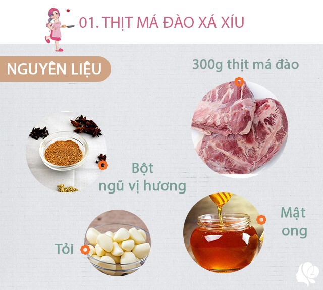 Chuẩn bị: - 300g thịt má đào - 1 gói ngũ vị hương - 1 củ tỏi - 2 thìa cà phê mật ong - Gia vị: Đường trắng, hạt tiêu xay, 1 muỗng cà phê dầu hào, 3 muỗng cà phê xì dầu.
