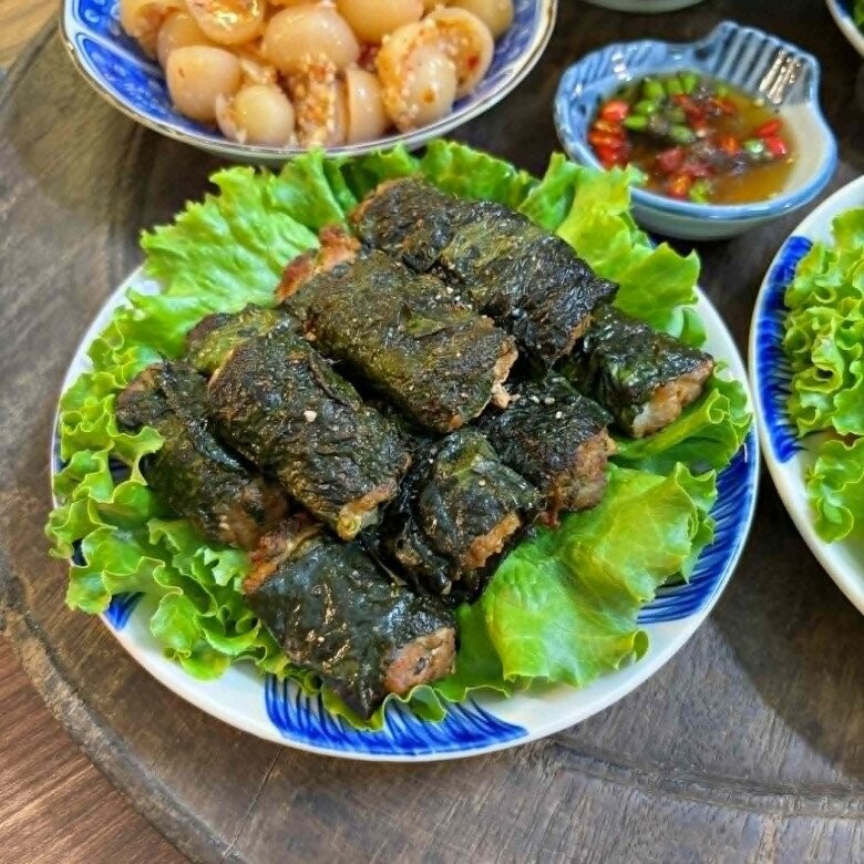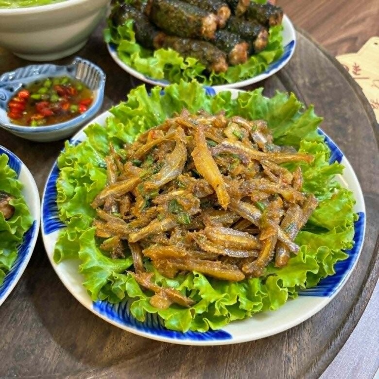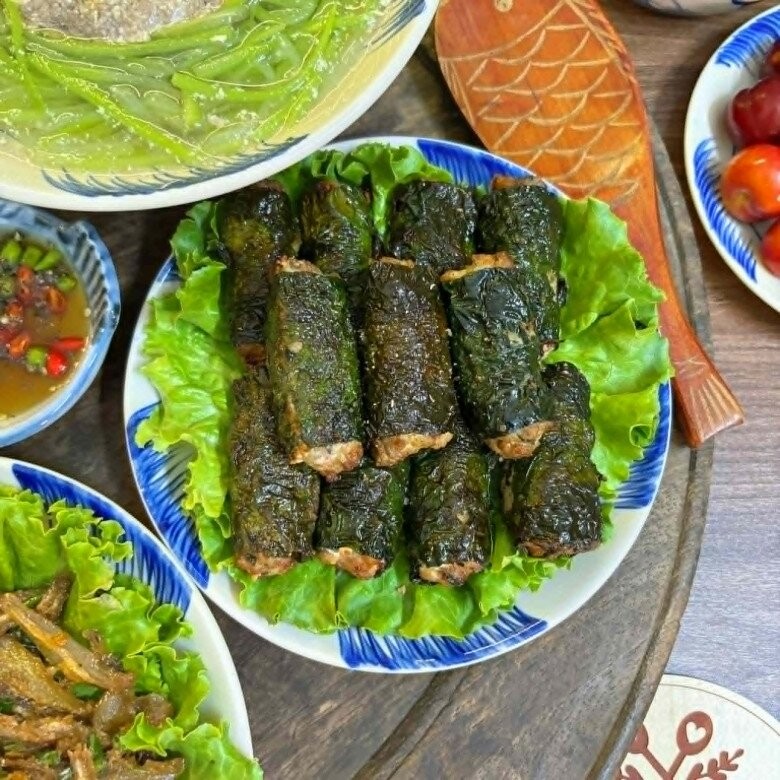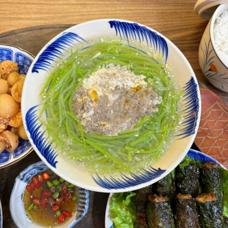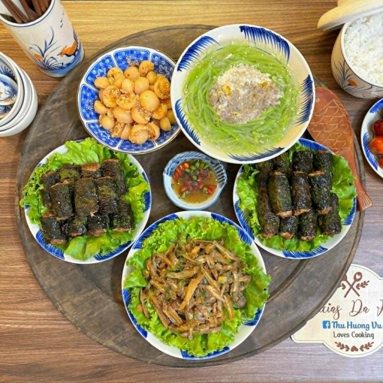 Mâm cơm dân dã, quen thuộc mà đưa cơm vô cùng: Chả lá lốt thơm nức, chả xương sông đậm vị, bát canh bầu nấu cua ngọt mát thanh nhẹ, thêm đĩa cá cơm rim mặn đậm đà và chút cà dầm giòn giòn chua dịu. Những món quen thuộc kết hợp hài hòa, tạo nên bữa cơm giản dị nhưng đủ sức níu chân cả nhà bên mâm cơm nóng hổi.