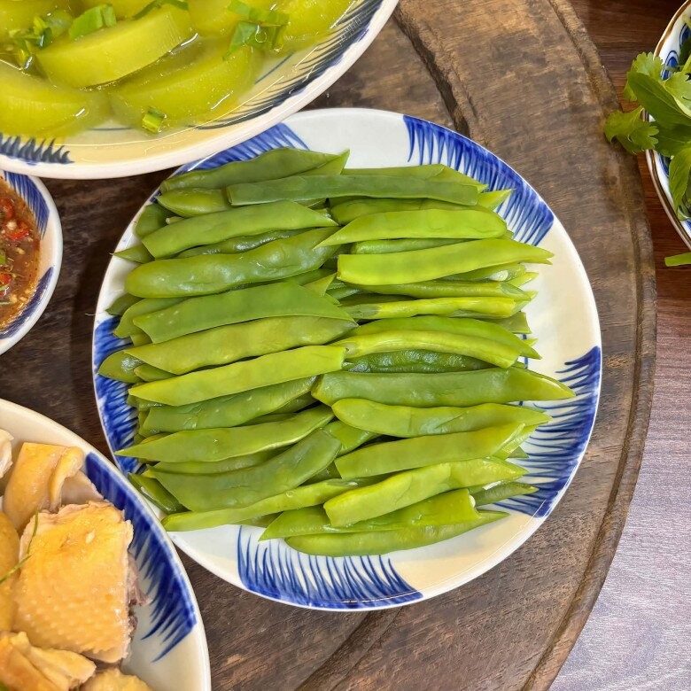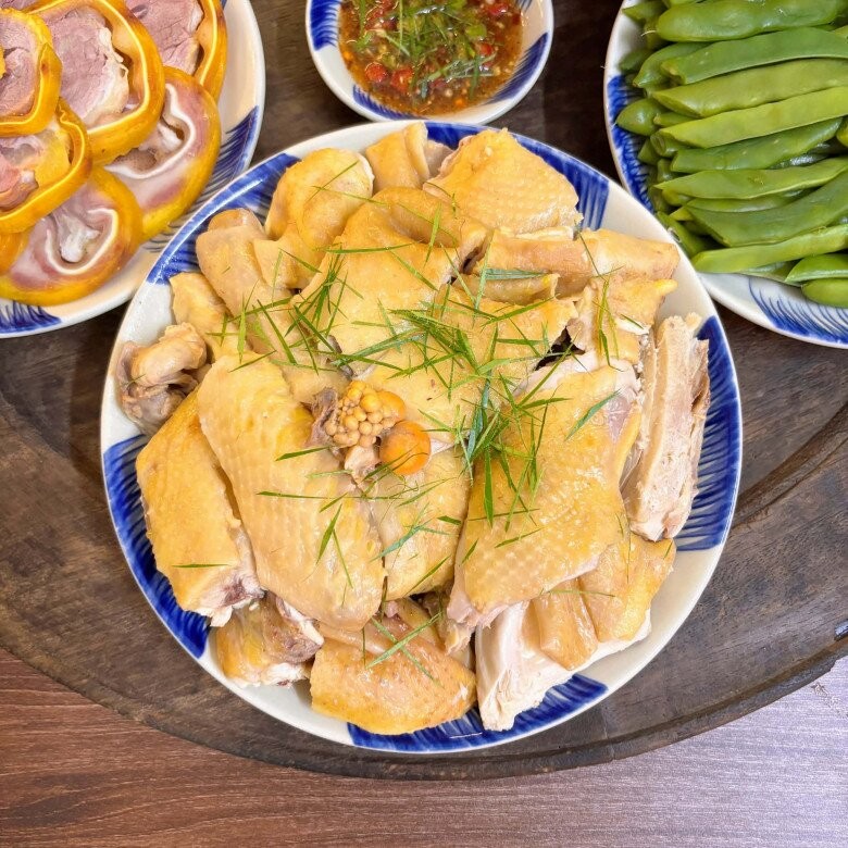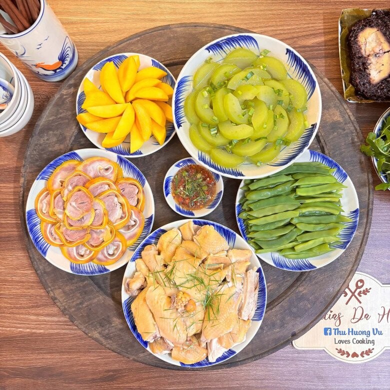 Gà mái ri luộc ngọt thịt, thơm tự nhiên; canh bí xanh nấu từ nước luộc gà thanh mát, nhẹ nhàng; tai heo cuộn bắp giò ủ muối đậm đà, giòn sật tạo điểm nhấn; còn đậu cove luộc giúp cân bằng vị giác, mang lại cảm giác thanh sạch cho toàn bộ mâm cơm.