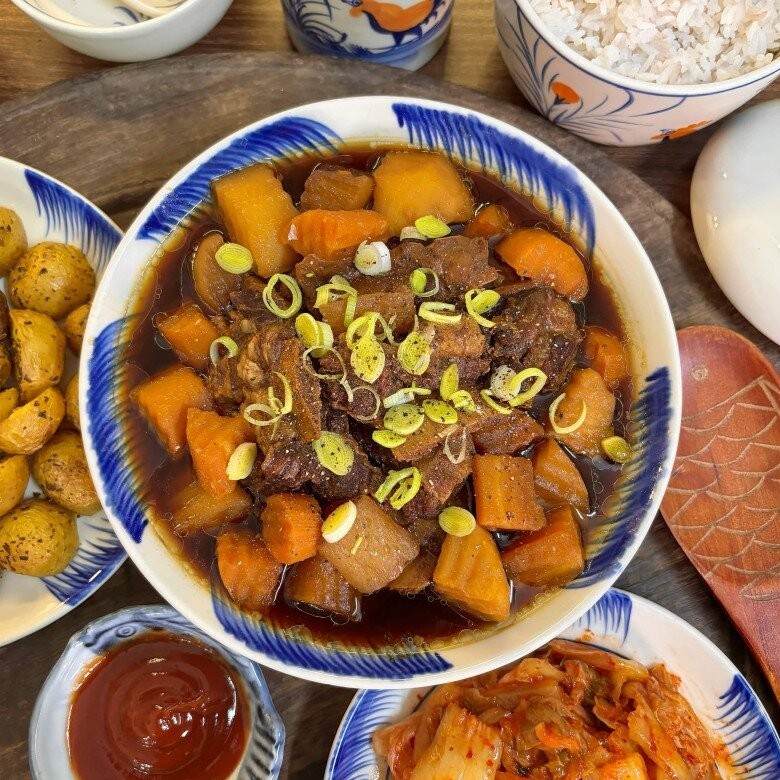 Hôm nay căn bếp nhỏ thơm nức mùi hương nồng nàn của món Sườn bò hầm rau củ kiểu Hàn. Từng miếng sườn bò được hầm chín mềm, thấm đẫm nước xốt đặc sánh, hòa quyện cùng vị ngọt thanh của các loại củ quả tươi. Để bữa ăn thêm tròn vị, không thể thiếu đĩa kim chi cải thảo giòn cay giúp kích thích vị giác và thêm một chút khoai tây nướng bùi thơm, vàng ruộm. Một mâm cơm mang hơi thở xứ Kim Chi nhưng lại đầy cảm giác gần gũi, ấm áp cho cả gia đình.
