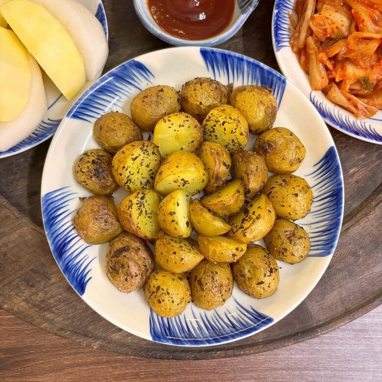 Khoai tây rửa thật sạch vỏ không cần gọt, sau đó bổ đôi. Xếp khoai tây lên khay nướng rồi xịt chút dầu ăn, tắc lên chút muối với lá oregano rồi cho vào lò nướng chín là xong.