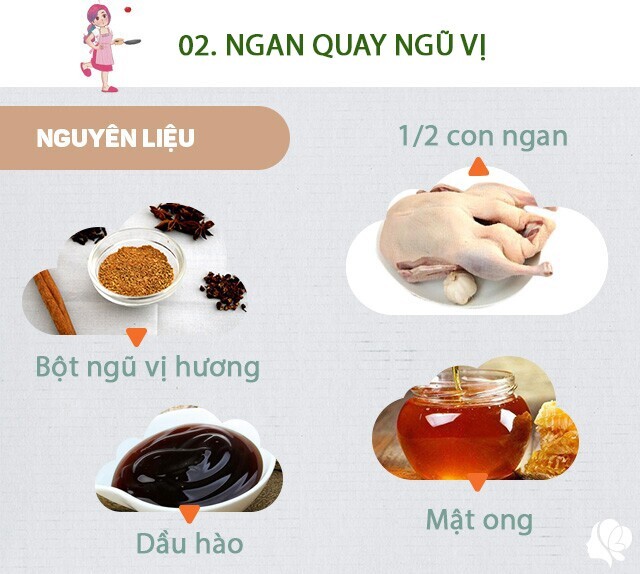 Nguyên liệu: Ngan 1/2 con (1kg) - ½ thìa ngũ vị hương - ½ thìa ớt bột - 2 thìa dầu hào - 2 thìa mật ong - 2 thìa giấm - 2 thìa muối