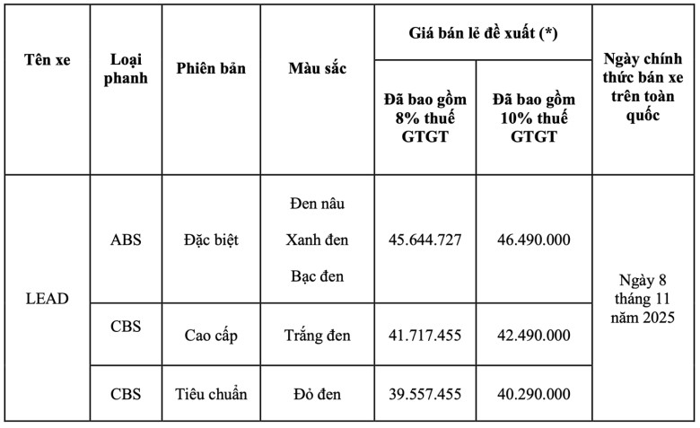 Từ tháng 11 này, LEAD ABS 2026 sẽ chính thức được bán ra thị trường thông qua Hệ thống Cửa hàng Bán xe và Dịch vụ do Honda Ủy nhiệm (HEAD) trên toàn quốc với giá bán lẻ đề xuất như sau: