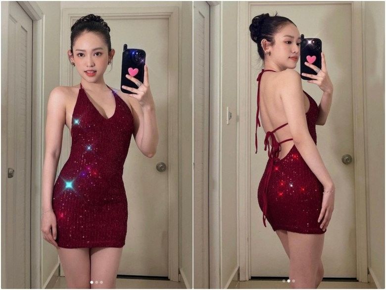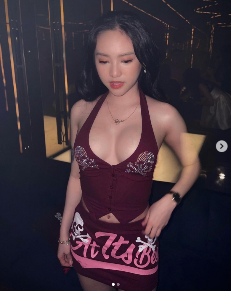 Mặc cả combo váy áo màu đỏ sậm đi "quẩy", Thuý Vi hút mọi ánh nhìn vào đường cong hình thể chuẩn mực và làn da trắng mịn.