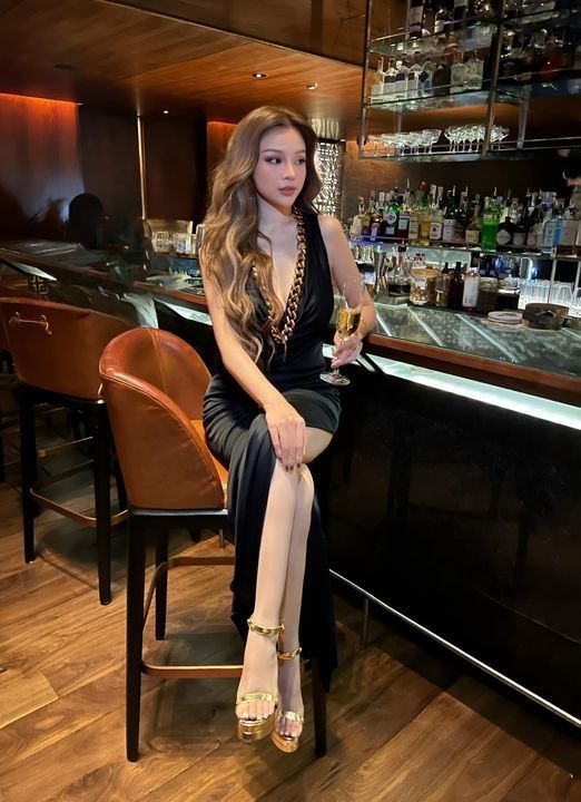 Hot girl đời đầu diện một chiếc váy đen ôm sát cơ thể và một chiếc áo yếm hở táo bạo.