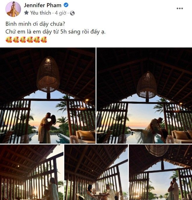 Ít giờ trước, trên trang cá nhân Hoa hậu Jennifer Phạm khoe ảnh hôn chồng đắm đuối ở một resort sang chảnh. Người đẹp viết: “Bình minh ơi dậy chưa? Chứ em là em dậy từ 5 giờ sáng rồi đấy ạ”. Trong ảnh, cô và ông xã - doanh nhân Đức Hải - ăn mặc khá giản dị, cùng nhau tận hưởng những khoảnh khắc ngọt ngào khi bình minh vừa lên.