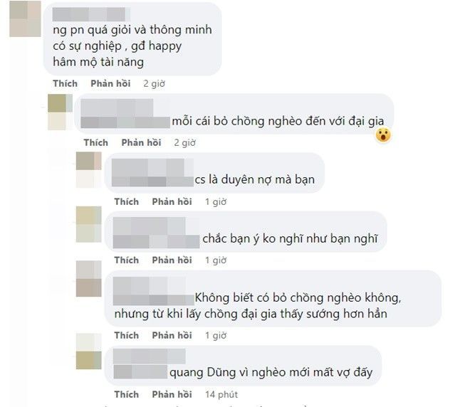 Tuy nhiên, giữa hàng trăm bình luận khen ngợi nhan sắc “lão hóa ngược” của nữ MC cùng lời chúc phúc vì cô đã có cuộc sống hôn nhân viên mãn sau khi ly hôn Quang Dũng thì vẫn xuất hiện nhận xét mỉa mai: “Mỗi tội bỏ chồng nghèo đến với đại gia”. Ngay sau đó một người cũng đồng thuận trả lời: “Không biết bỏ chồng nghèo không, nhưng từ khi lấy đại gia thấy sướng hơn hẳn”, “Quang Dũng vì nghèo mới mất vợ đấy”.