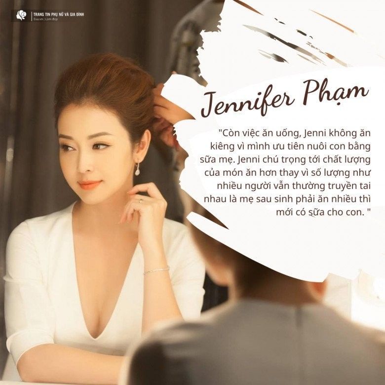 Thường sau sinh, Jenni kiêng kĩ rất khắt khe trong tháng đầu tiên, tránh vận động quá nặng. Sau khoảng 3 tháng, mình sẽ tận dụng thời gian con ngủ hoặc khi có sự trợ giúp của người nhà trong việc trông con thì Jenni sẽ tập với huấn luyện viên cá nhân. Phụ nữ sau sinh trong 6 tháng đầu là khoảng thời gian vàng để có thể lấy lại vóc dáng. Phần mỡ nếu để tích tụ trong thời gian quá lâu sẽ thành mỡ rắn và khó giảm hơn. Tuy nhiên, mình cũng phải lưu ý tập với cường độ hợp lý để cân bằng dinh dưỡng cho mình và đảm bảo chất lượng sữa cho con.