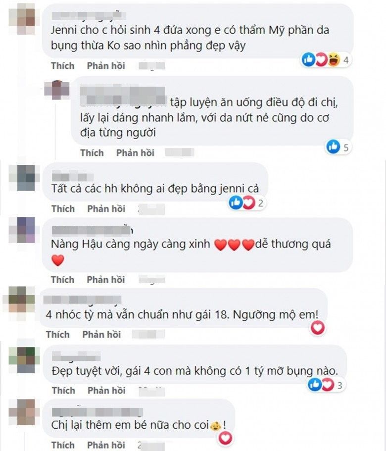 Có lẽ vì quá ngỡ ngàng trước sắc vóc của mỹ nhân 8X mà người này đã đặt câu hỏi: "Jenni cho chị hỏi sinh xong 4 đứa em có thẩm mỹ phần da bụng thừa không sao nhìn phẳng đẹp vậy".