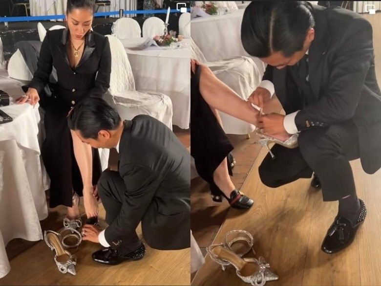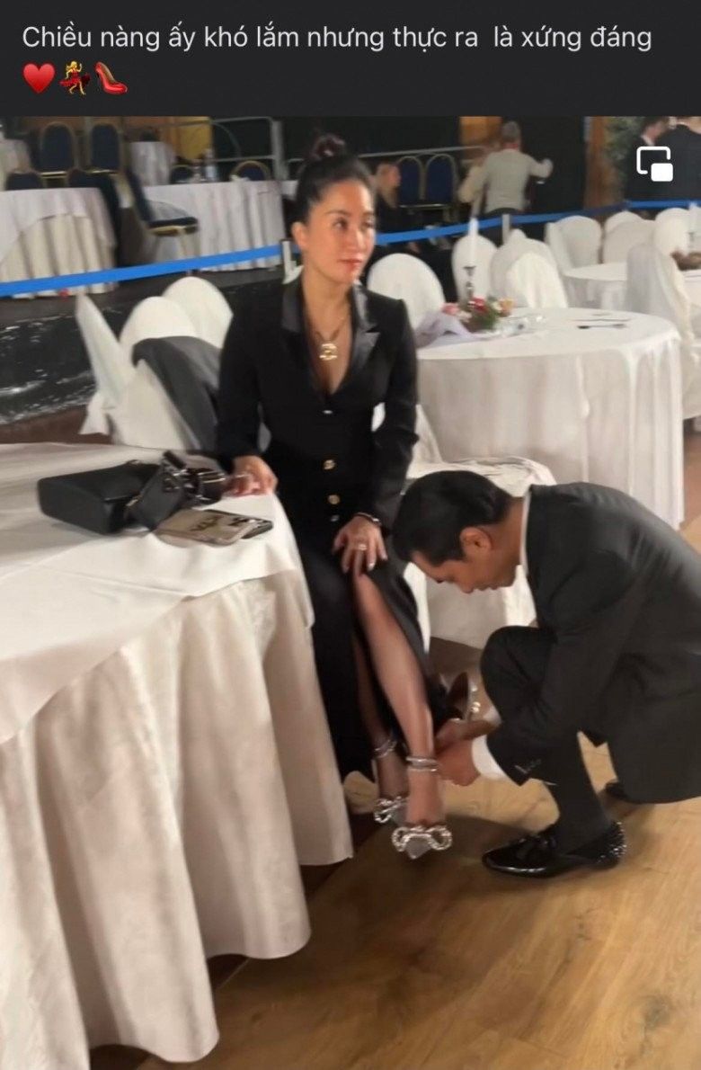 Trong clip, Phan Hiển đã ân cần ngồi xuống, tận tay tháo đôi giày cao gót và mang một đôi giày đế thấp hơn cho bà xã Khánh Thi. Chia sẻ cùng đoạn video, Phan Hiển viết: "Chiều nàng ấy khó lắm nhưng thực ra là xứng đáng".
