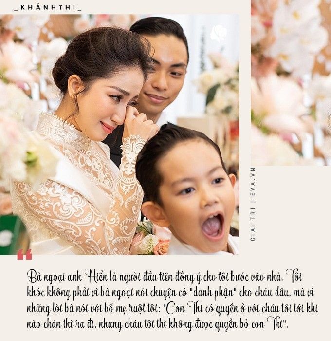 Bà ngoại của anh Hiển là người đầu tiên đồng ý cho tôi bước vào nhà. Bà cũng là người làm kinh tế cho cả gia đình và nổi tiếng. Tôi khóc không phải vì bà nói chuyện cháu dâu có "danh phận", mà vì những lời bà nói với bố mẹ ruột tôi. Trước 2 họ, bà ngoại nói hãy yên tâm vì: "Bà quý Khánh Thi hơn cả cháu ruột. Con Thi có quyền ở với cháu tôi tới khi nào chán thì ra đi, nhưng cháu tôi thì không được quyền bỏ con Thi". Đó mới là câu khiến tôi cảm thấy hạnh phúc vào giây phút đó.
