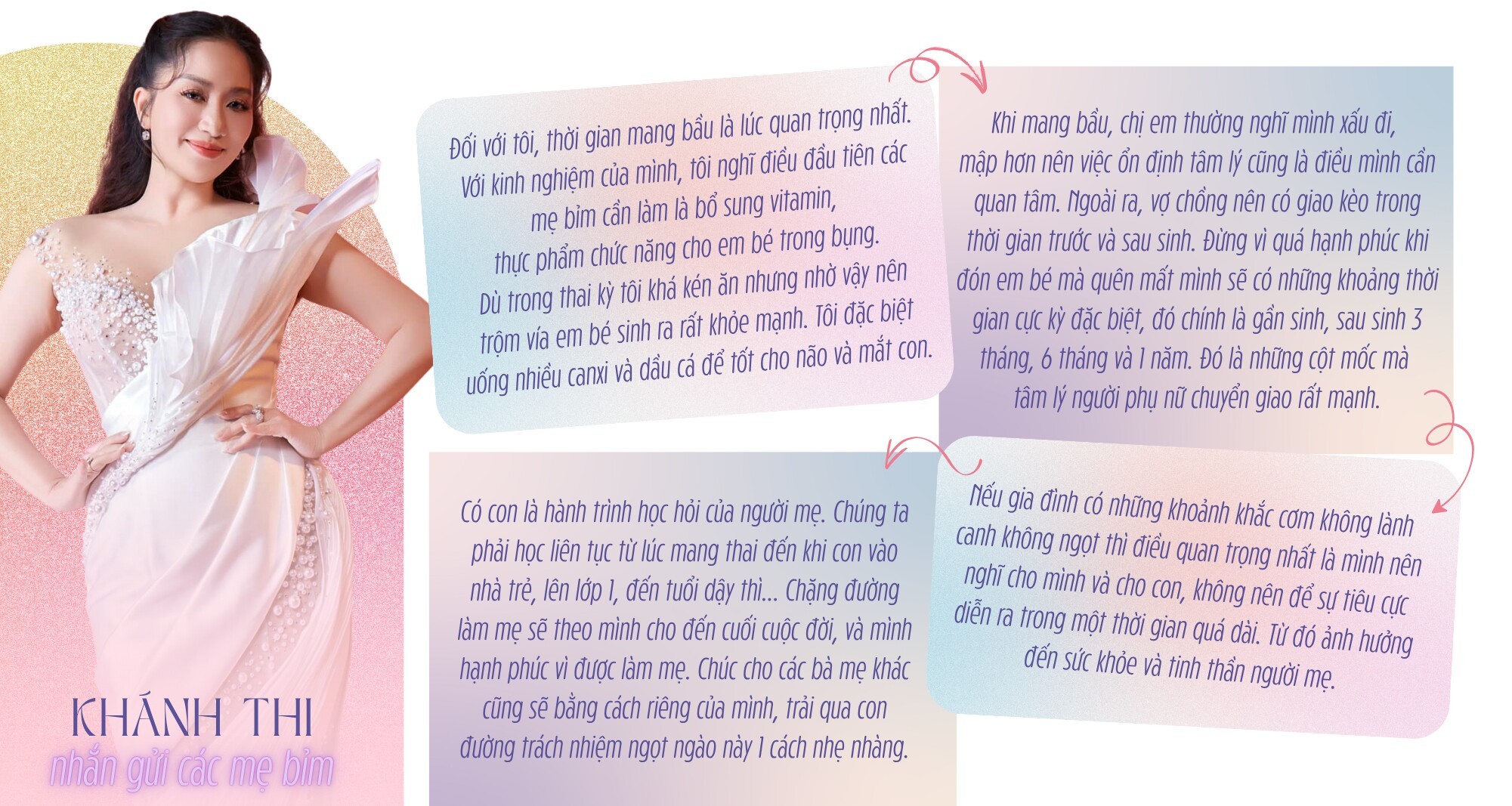 Mỗi lần mang thai đối với tôi đều là một trải nghiệm mới và đáng nhớ riêng. Nhưng có lẽ việc mang thai em bé đầu đời năm 2015 để lại nhiều ấn tượng sâu sắc nhất trong lòng tôi. Lần đầu tiên làm mẹ nên tôi đã có rất nhiều bỡ ngỡ, thậm chí là không tin. Nhất là khi ấy tôi chuẩn bị ra mắt 2 bài hát Tự tin là con gái và Cố lên cô gái nhỏ. Ngoài ra, tôi cũng đang là giám khảo cuộc thi Bước Nhảy Hoàn Vũ. Có thể nói, bấy giờ tôi đang nổi tiếng đương thời và được nhiều người quan tâm. Vừa mới quay MV xong chuẩn bị ra mắt, thì được biết là mình có bầu. Cho nên đây là một cú sốc lớn với tôi.