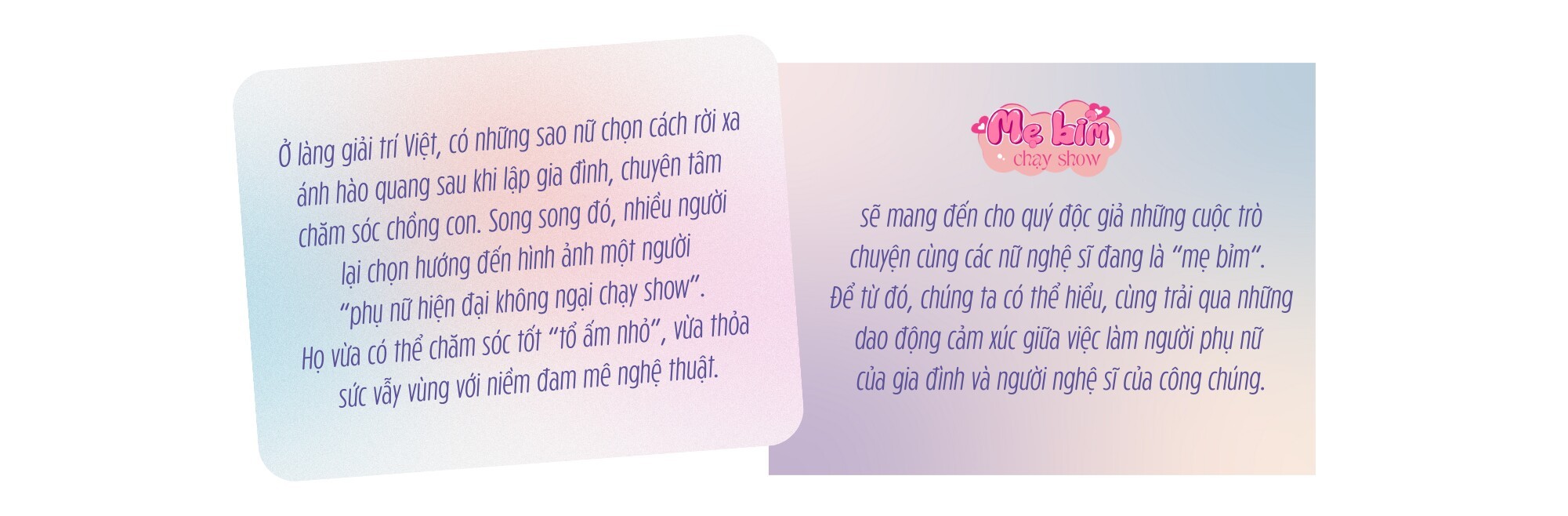 Ngày xưa, người phụ nữ phải ở nhà chăm con. Tôi không sinh ra ở thời đó nên tôi không lạm bàn. Nhưng tôi nhớ đến mẹ tôi. Bà là ca sĩ ở Tổng cục chính trị, lấy bố tôi là nhạc công. Sau đó mẹ tôi nghỉ, về làm cô nuôi dạy trẻ trong một trường mầm non. Ngoài ra, mẹ tôi còn mở quán nước kiếm thêm. Lúc đó tôi đã thấy mẹ mình rất tần tảo rồi. Tôi ngưỡng mộ những người phụ nữ vừa lo tốt việc xã hội vừa chăm sóc gia đình chu đáo như vậy.