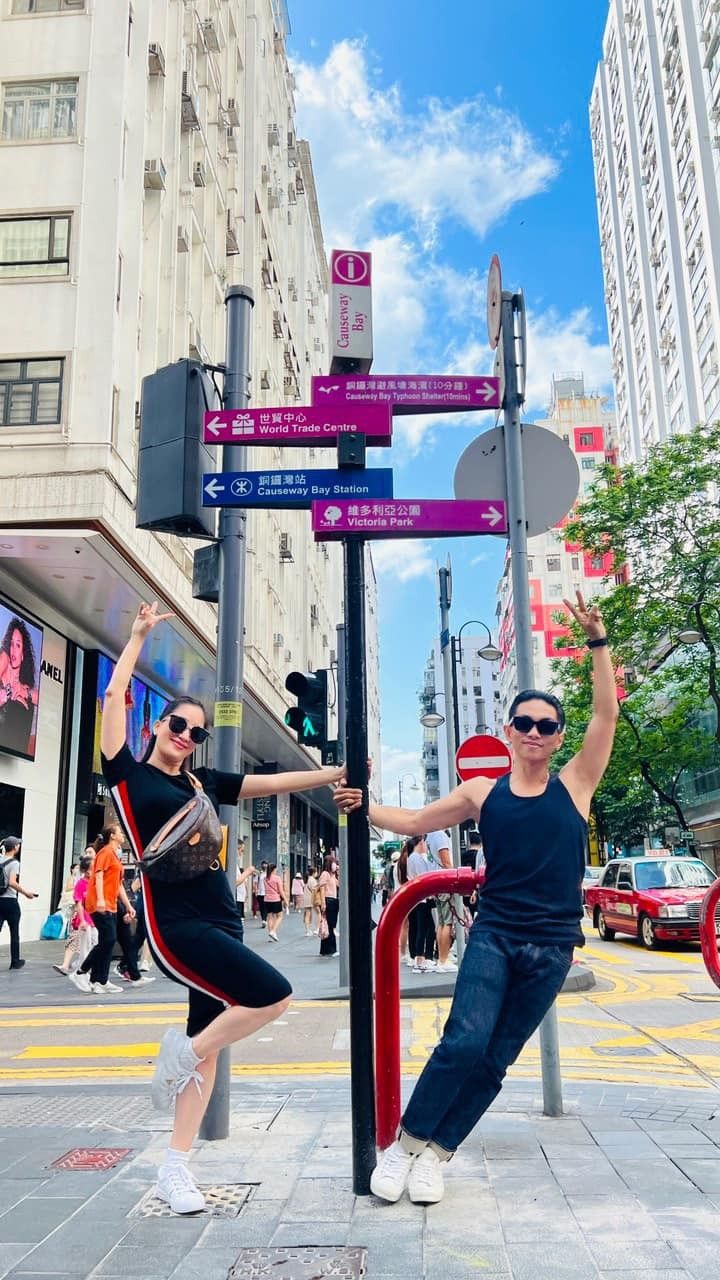 Bà bầu Khánh Thi cùng chồng nhảy nhót trên đường phố Hong Kong.