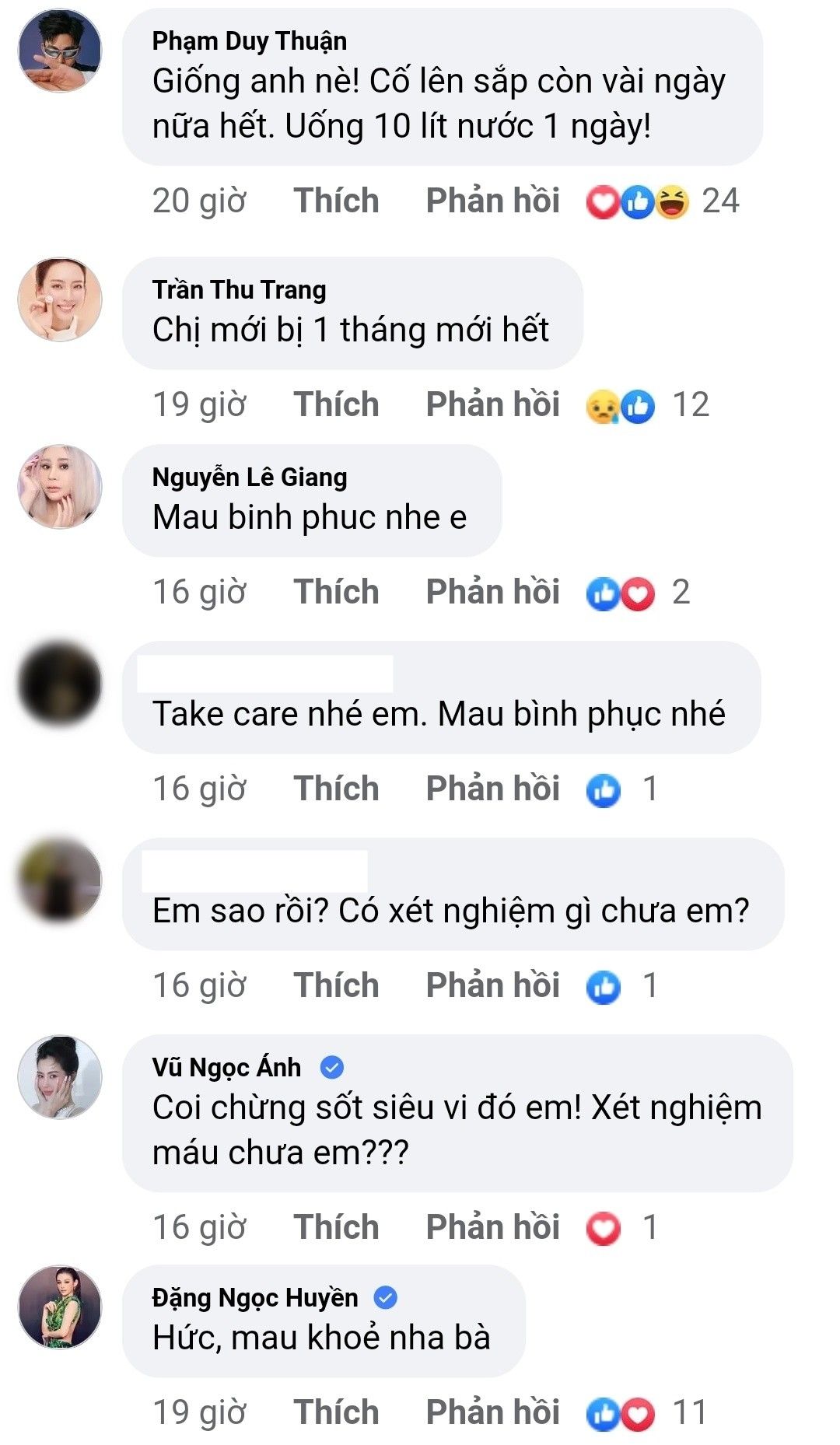 Nghệ sĩ Lê Giang nhắn nhủ: "Mau bình phục nhé em". Cựu hot girl Huyền Baby cũng an ủi người bạn: "Hức, mau khoẻ nha bà".