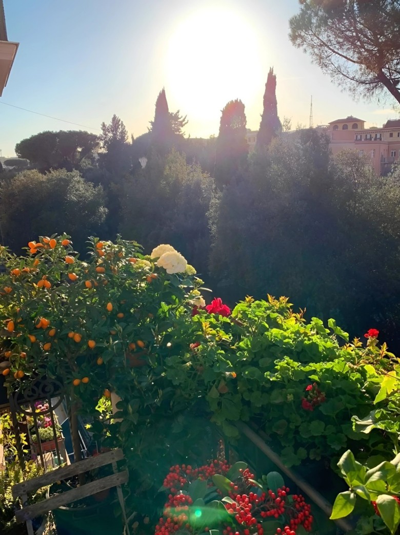 Không gian được bao phủ bởi cây xanh ở nhiều góc, từ ban công đến phòng khách. Từ ban công, gia đình có thể nhìn ra những tòa nhà cổ hàng trăm năm tuổi, đặc trưng của Rome.